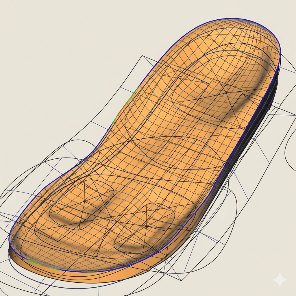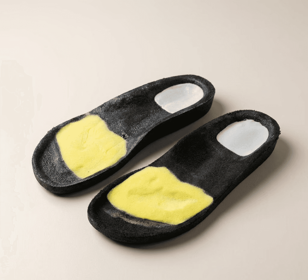Designed from patient-specific data using CAD/CAM workflows, ensuring accurate geometry, repeatability, and seamless integration of biomechanical features into the sandal design.